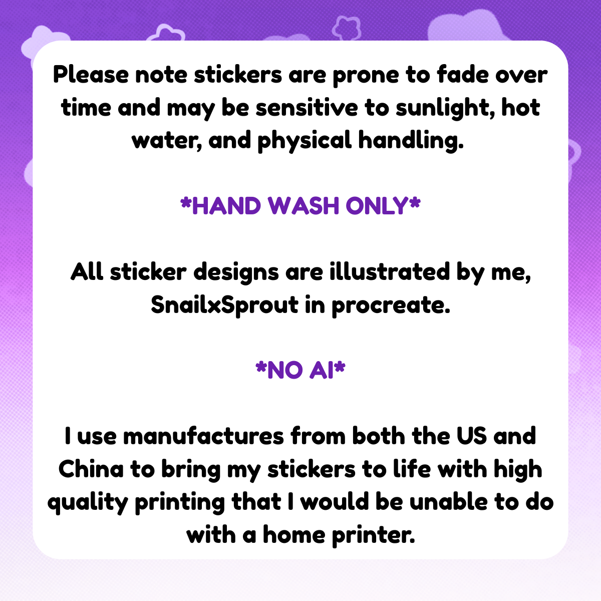 All sticker designs are illustrated by me, SnailxSprout in procreate. NO AI. I use manufactures from both the US and China to bring my stickers to life with high quality printing that I would be unable to do with a home printer.
