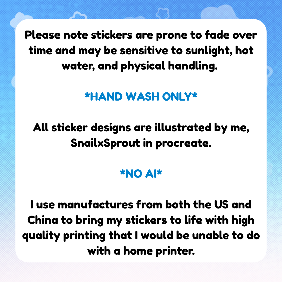 All sticker designs are illustrated by me, SnailxSprout in procreate. NO AI. I use manufactures from both the US and China to bring my stickers to life with high quality printing that I would be unable to do with a home printer.
